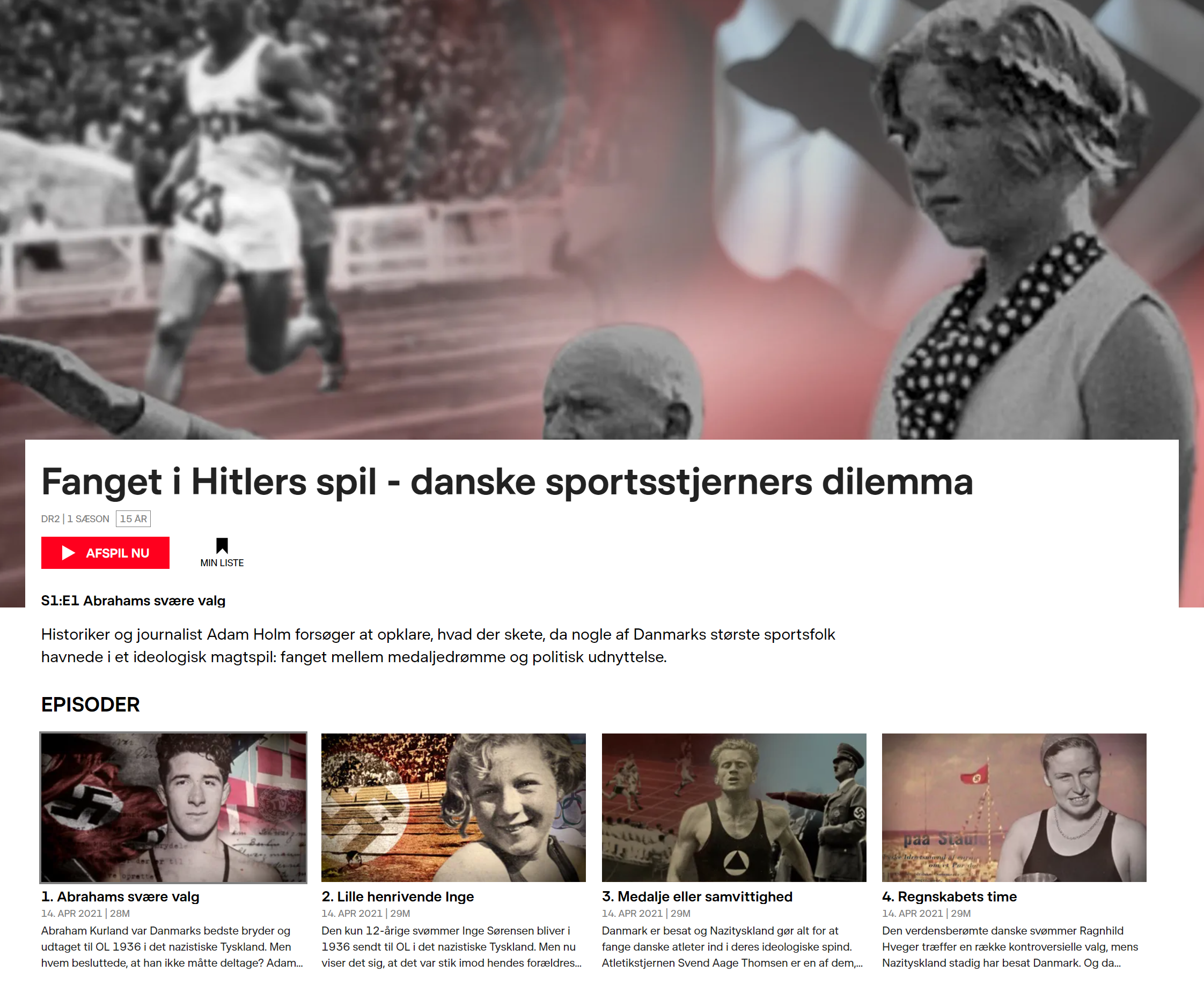 Historiker og journalist Adam Holm forsøger i Fanget i Hitlers spil fra DR.TV at opklare, hvad der skete, da nogle af Danmarks største sportsfolk havnede i et ideologisk magtspil. De befandt sig i et spændingsfelt mellem medaljedrømme, nationale ambitioner og en politisk virkelighed, hvor idrætten blev brugt aktivt i Hitlers propagandaapparat.